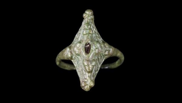 The “kite-shaped ring with a garnet or red glass center” was unearthed by a volunteer at the site of a fort in Burghead, in northeast Scotland, according to the University of Aberdeen, which led the dig.