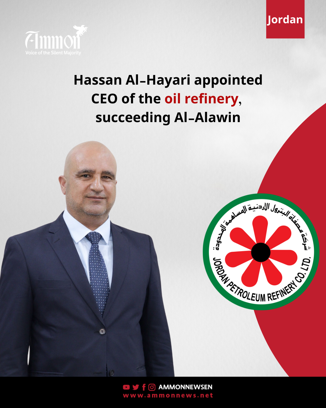 Ammon News - Ammon was informed that Engineer Hassan Al-Hayari will become the new CEO of Jopetrol in early December, replacing Abdul Karim Al-Alaween, under the leadership of Engineer Abdul Rahim Al-Baqaei and the Board of Directors of the Jordan Petroleum Refinery Company.