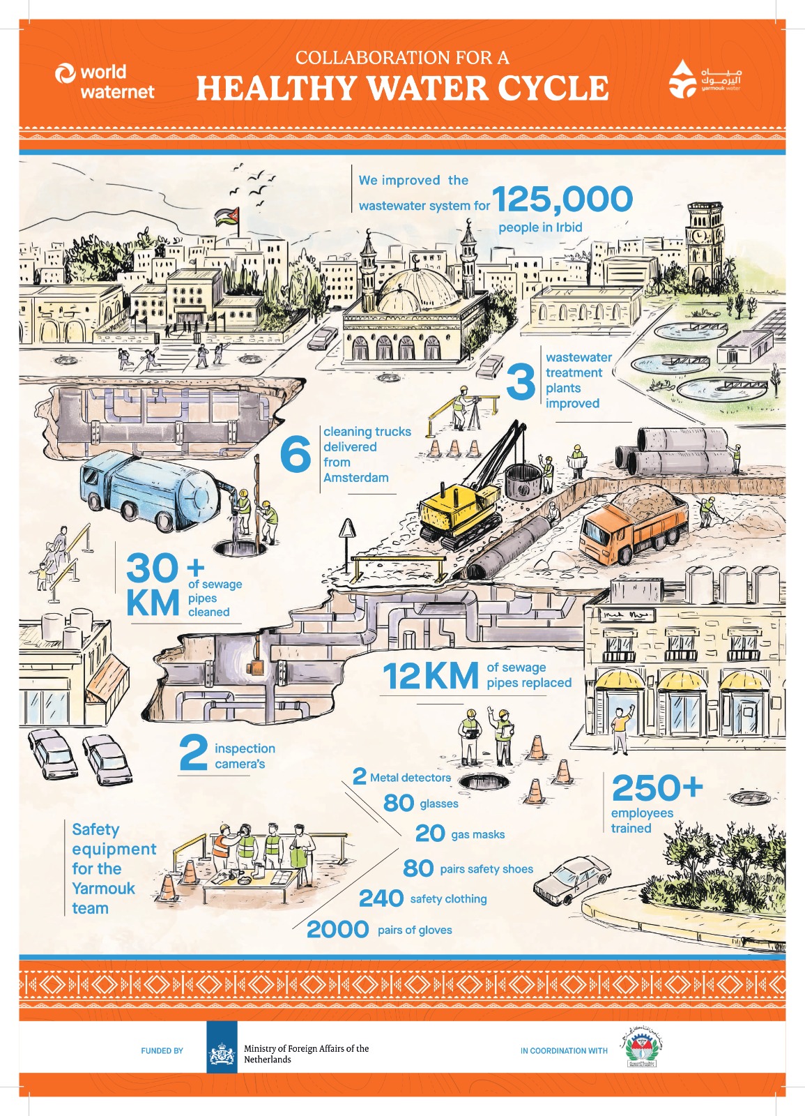 1. Upgraded Infrastructure: Replacement of 12 kilometers of outdated sewer pipes in Irbid’s city centre, reducing blockages and enhancing wastewater flow.