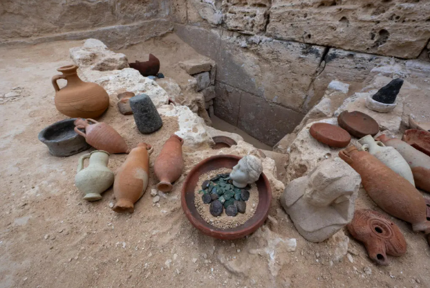 The team also found a half-length statue of a king wearing the Nemes headdress, 337 coins, many featuring Queen Cleopatra VII’s image, alongside ritual pottery, oil lamps, limestone containers, bronze statues, a scarab amulet inscribed with “The justice of Ra has arisen” and an array of other artifacts.