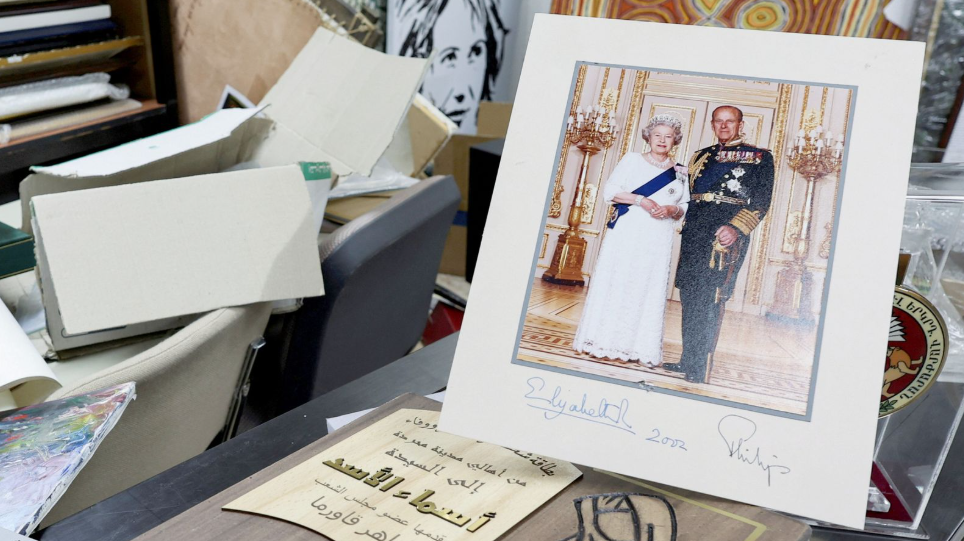 Ammon News - A signed picture of Queen Elizabeth II and Prince Philip has been found among the souvenirs in the packed "treasure room" of ousted Syrian leader Bashar al Assad.