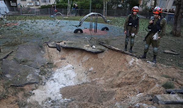 Medics said 16 people were lightly injured by shattered glass, including a three-year-old girl, while 14 were bruised while rushing to shelters. Footage from the park showed a crater where the missile had impacted.
