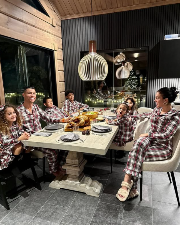 The 39-year-old footballer beamed as he donned matching tartan pyjamas with the youngsters and his partner Georgina Rodriguez, 30.