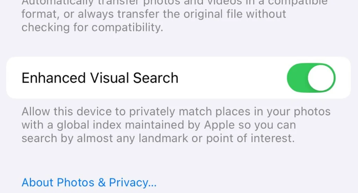 If you prefer not to use this feature, you can disable it. On an iPhone, navigate to Settings > Apps > Photos and toggle off "Enhanced Visual Search." On a Mac, this option can be found in the Photos app settings.