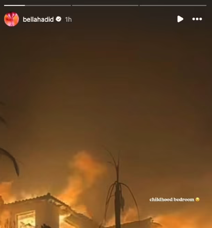 Ammon News - Bella Hadid shared a heartbreaking photo of her childhood home burning down amid the ongoing fires tearing through Los Angeles.