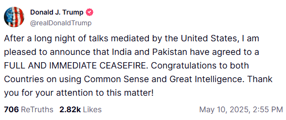In a post on social media platform Truth Social, the US President says: "After a long night of talks mediated by the United States, I am pleased to announce that India and Pakistan have agreed to a FULL AND IMMEDIATE CEASEFIRE.