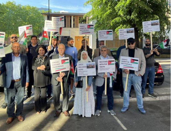 Helmi Al-Harahsheh, head of the Jordanian Forum in the United Kingdom, said the protest was a stand for truth and against what he described as attempts to distort the image of an institution dedicated to helping those in need.