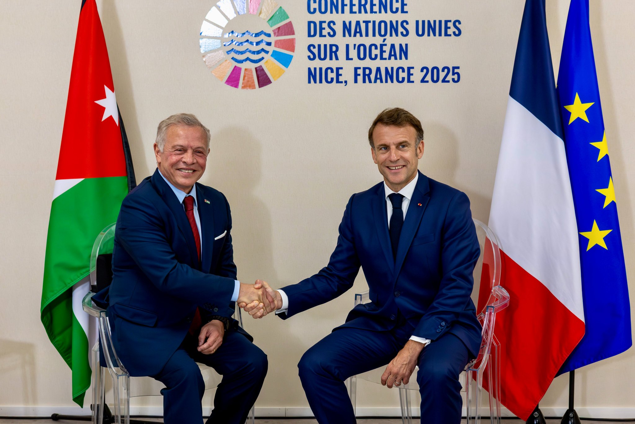The meeting, held on the sidelines of the third United Nations Ocean Conference, was attended by Deputy Prime Minister and Foreign Minister Ayman Safadi, Director of the Office of His Majesty Alaa Batayneh, and Jordan’s Ambassador to France Lina Al Hadid.