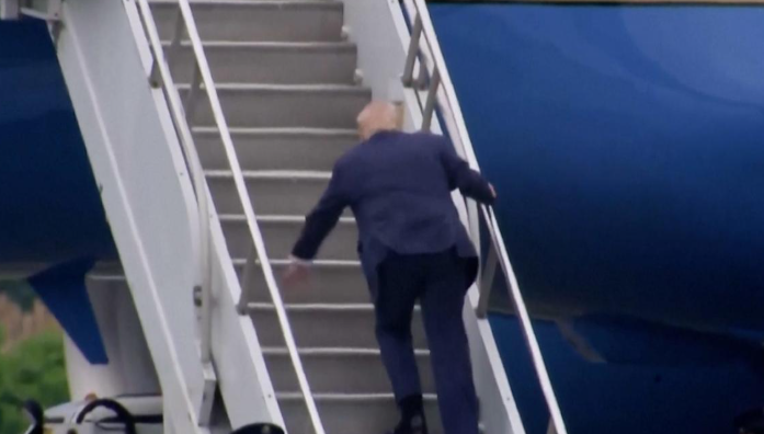 Trump lost his footing momentarily after a few steps, but steadied himself by gripping the railing, videos show. He then continued his climb up to Air Force One.