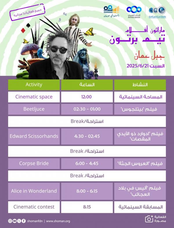 Ammon News - Abdul Hameed Shoman Foundation Cinema is organizing the "Cinema Marathon" next Saturday, June 21, from 12 pm until 9 pm at the Foundation's building in Jabal Amman.