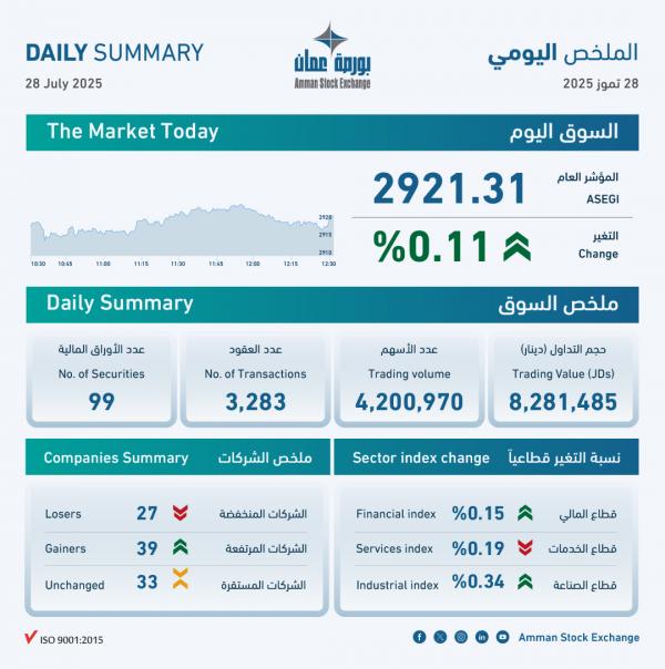 Ammon News - The Amman Stock Exchange (ASE) closed Monday’s trading 0.11% up, at 2,921 points.