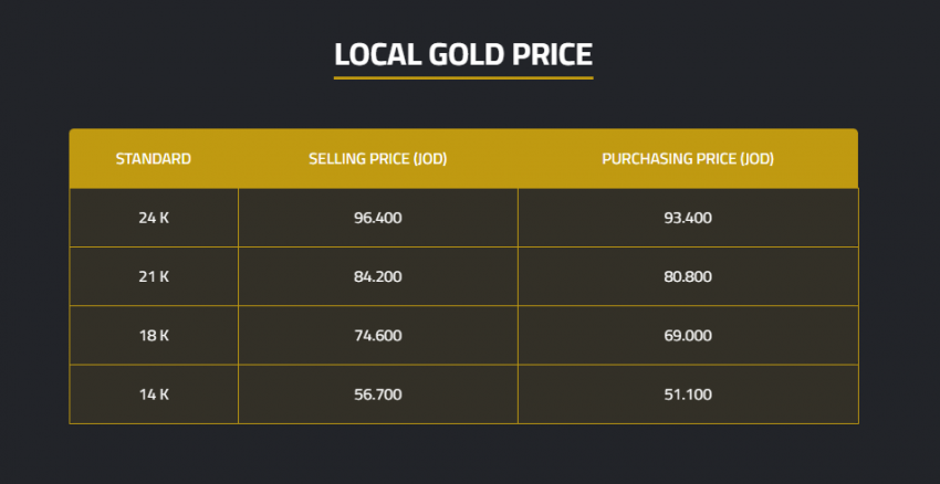 According to the daily bulletin, the selling prices per gram for 24-karat, 18-karat, and 14-karat gold were recorded at JD 96.4, JD 74.6, and JD 56.7, respectively.