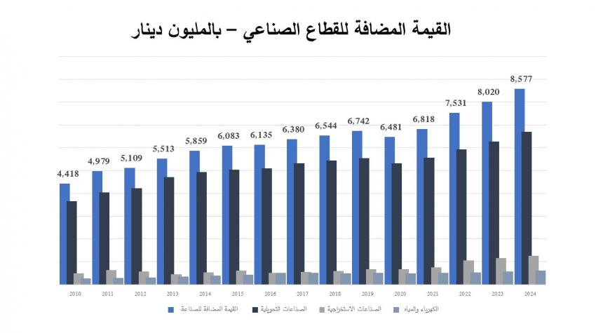 It indicated that the industrial sector's added value in the Kingdom reached JD8.6 billion last year, compared to 4.4 billion dinars in 2010, a cumulative increase exceeding 94 percent and an annual growth rate of nearly 5 percent in the past decade.