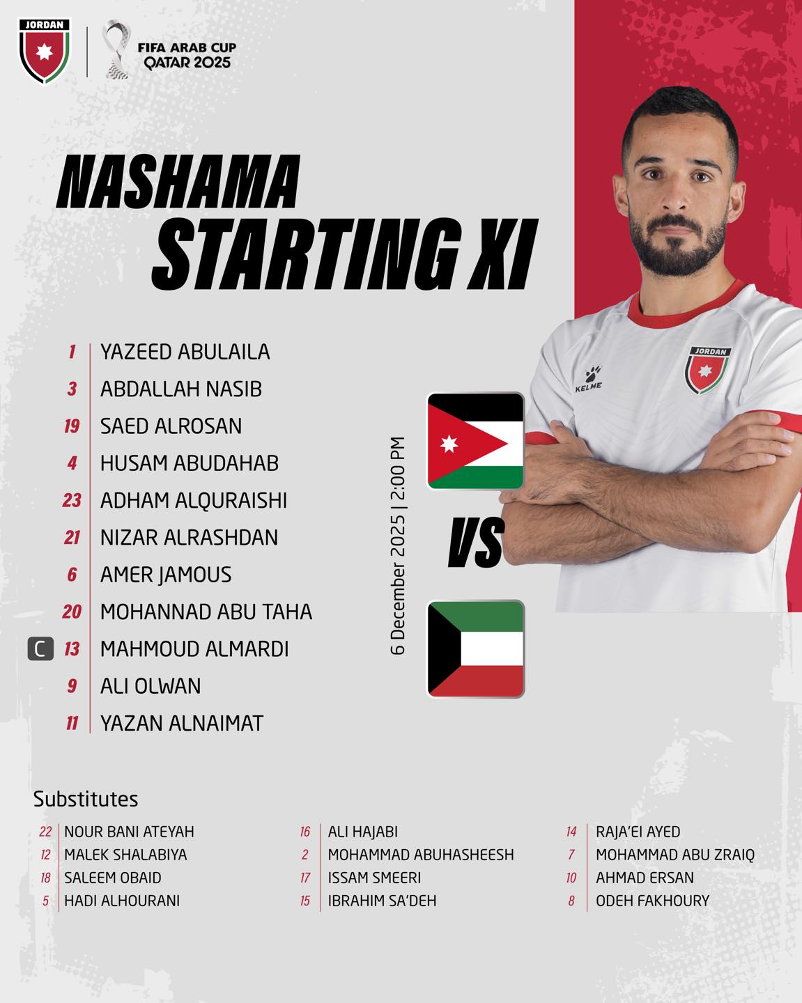 Ammon News - The Jordanian Football Association (JFA) has announced the national team's lineup for their match against Kuwait, scheduled for 2:00 PM on Saturday at Ahmed Bin Ali Stadium in Doha.
