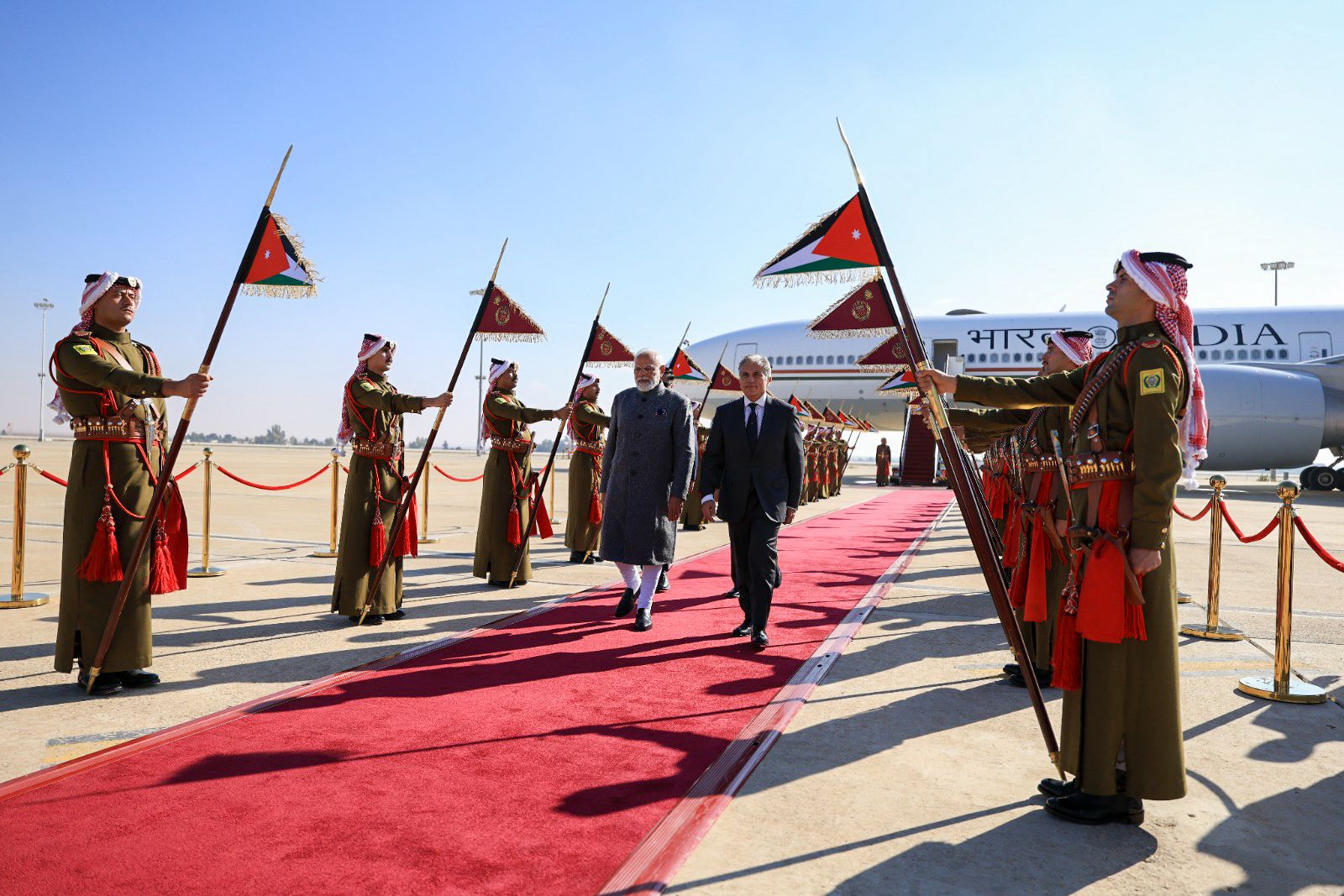 An official welcoming ceremony was held for the Prime Minister upon his arrival at Queen Alia International Airport, where a guard of honor lined up to greet him, and the national anthems of India and Jordan were played.