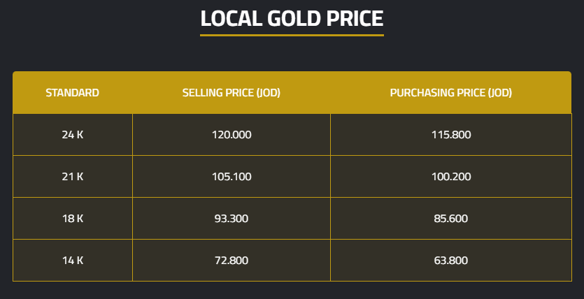 The selling prices per gram for 24-karat, 18-karat, and 14-karat gold were JD120.00, JD93.30, and JD72.80, respectively.
