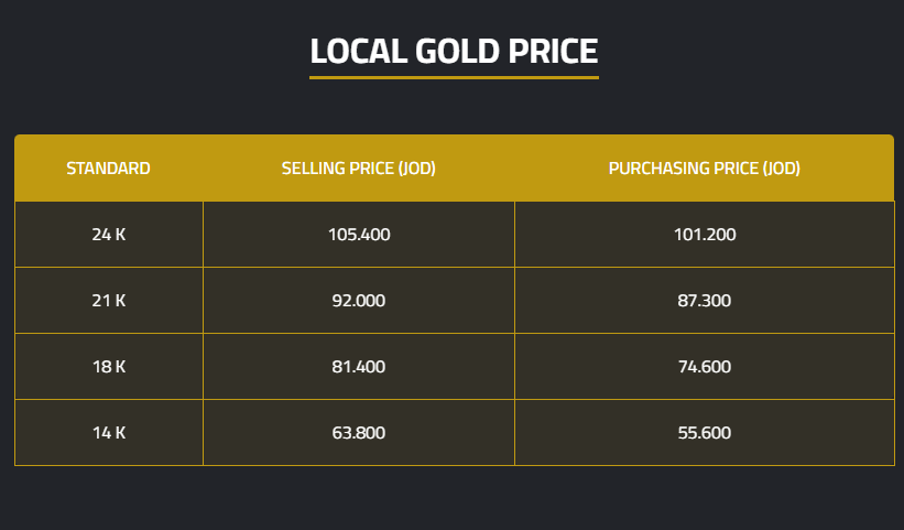 The selling prices per gram for 24-karat, 18-karat, and 14-karat gold were JD105.40, JD81.40, and JD63.80, respectively.