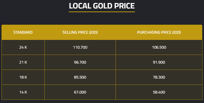The selling prices per gram for 24-karat, 18-karat, and 14-karat gold were JD110.70, JD85.50, and JD67.00, respectively.