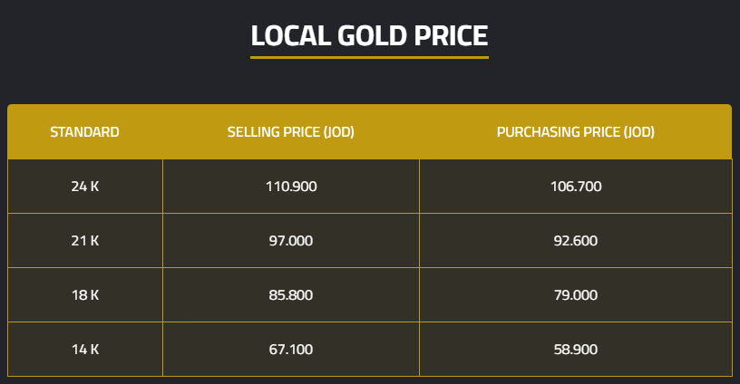 The selling prices per gram for 24-karat, 18-karat, and 14-karat gold were JD110.90, JD85.80, and JD67.10, respectively.