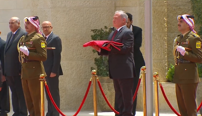 The King was presented with the Jordanian flag by Royal Hashemite Court Chief Yousef Issawi. His Majesty then handed the flag to an officer from the Jordan Armed Forces-Arab Army, who marched toward the flagpole to raise the flag.