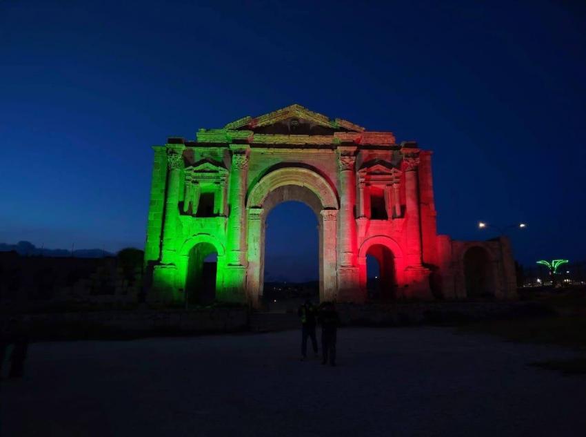 Ammon News - Several historic sites in Jordan are illuminated with the colors of the Jordanian flag, through an initiative carried out the ministry of tourism and Antiquities and the Department of Antiquities in celebration of the national flag day.