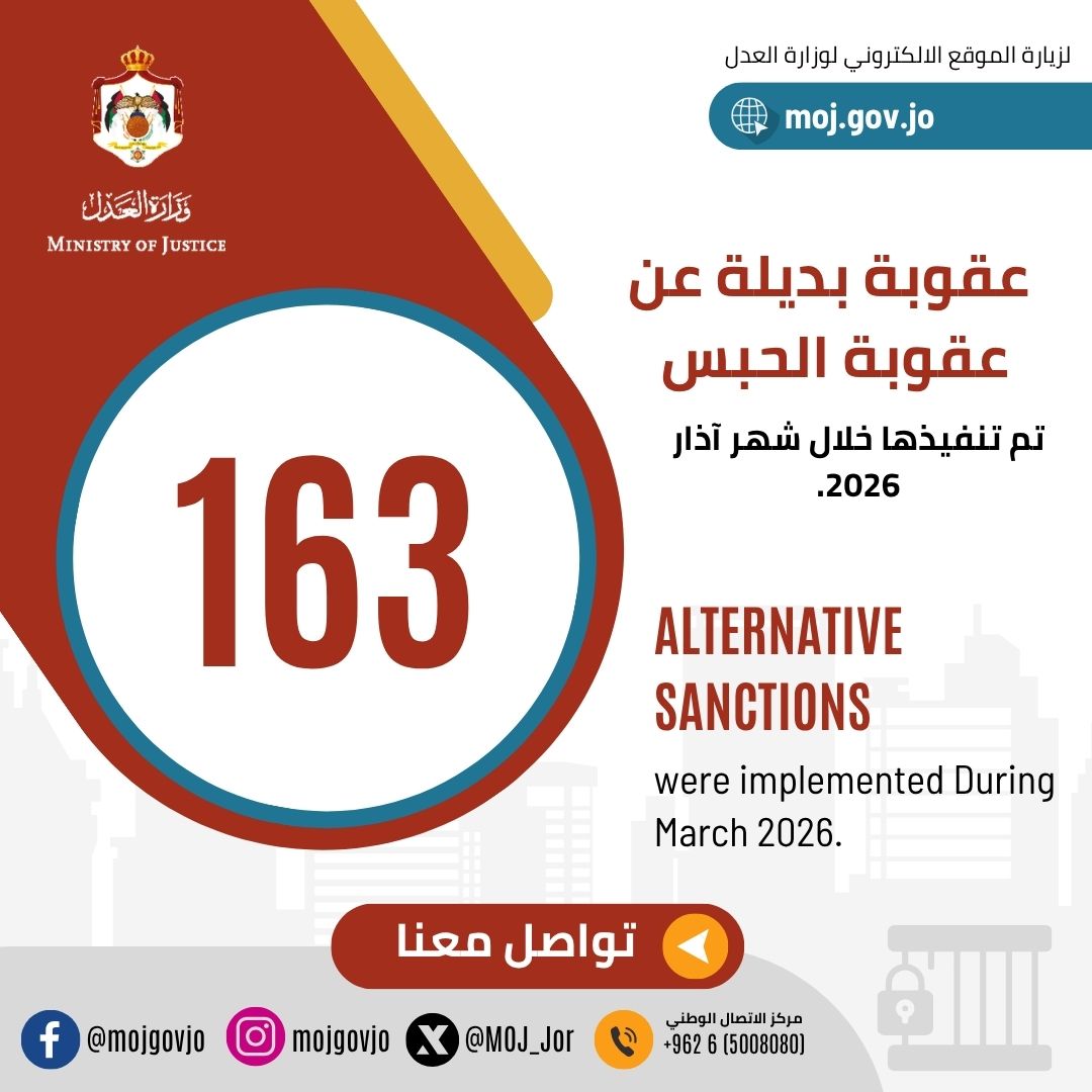 Ammon News - The Ministry of Justice announced that 163 alternative sanctions were implemented during March 2026.