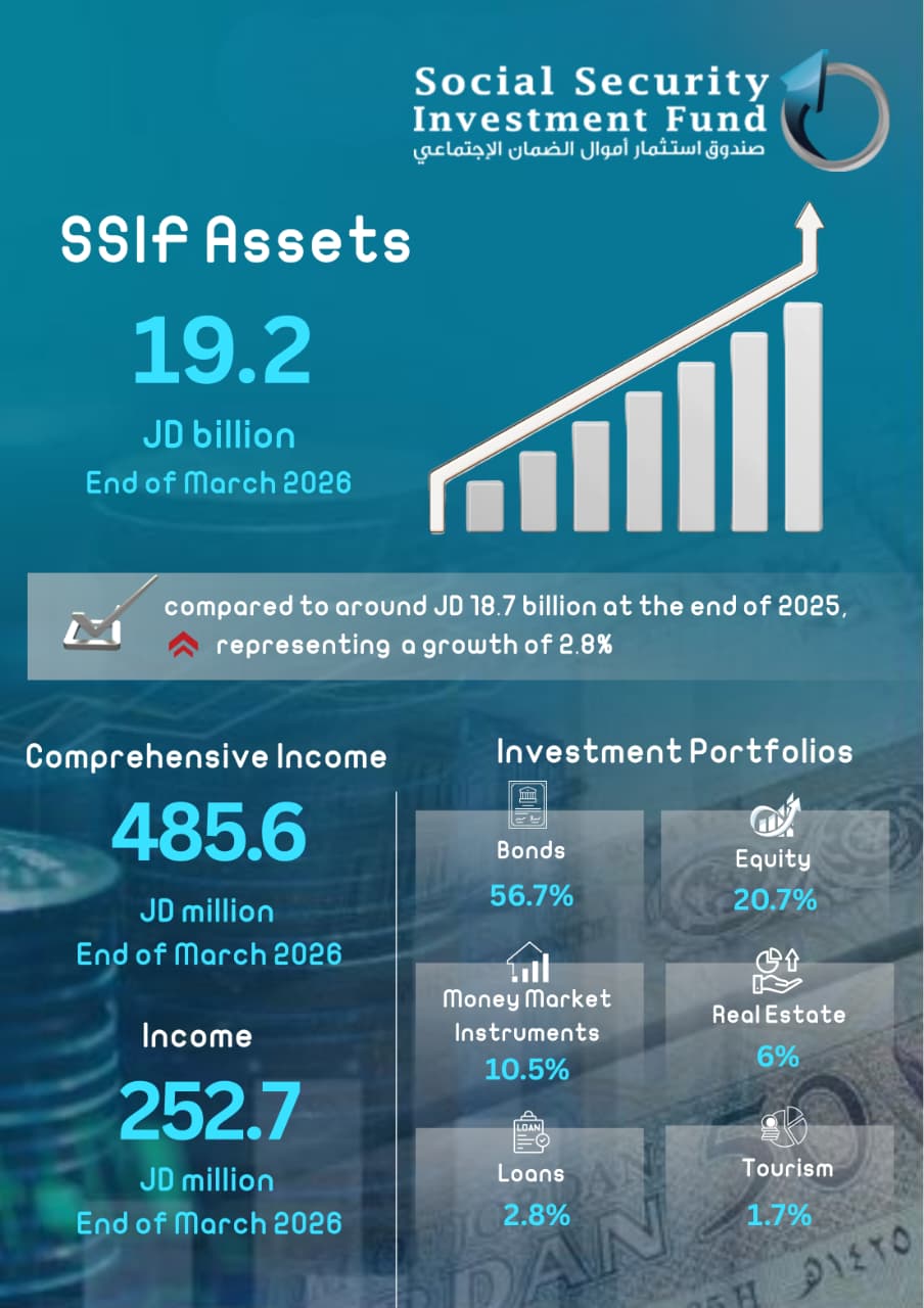 Ammon News - The Social Security Investment Fund (SSIF) closed Q1 2026 with assets under management of JD 19.2 billion, up JD 519 million year-to-date, or 2.8%, as sustained investment performance and an expanding strategic mandate continued to reinforce the fund's long-term growth trajectory.