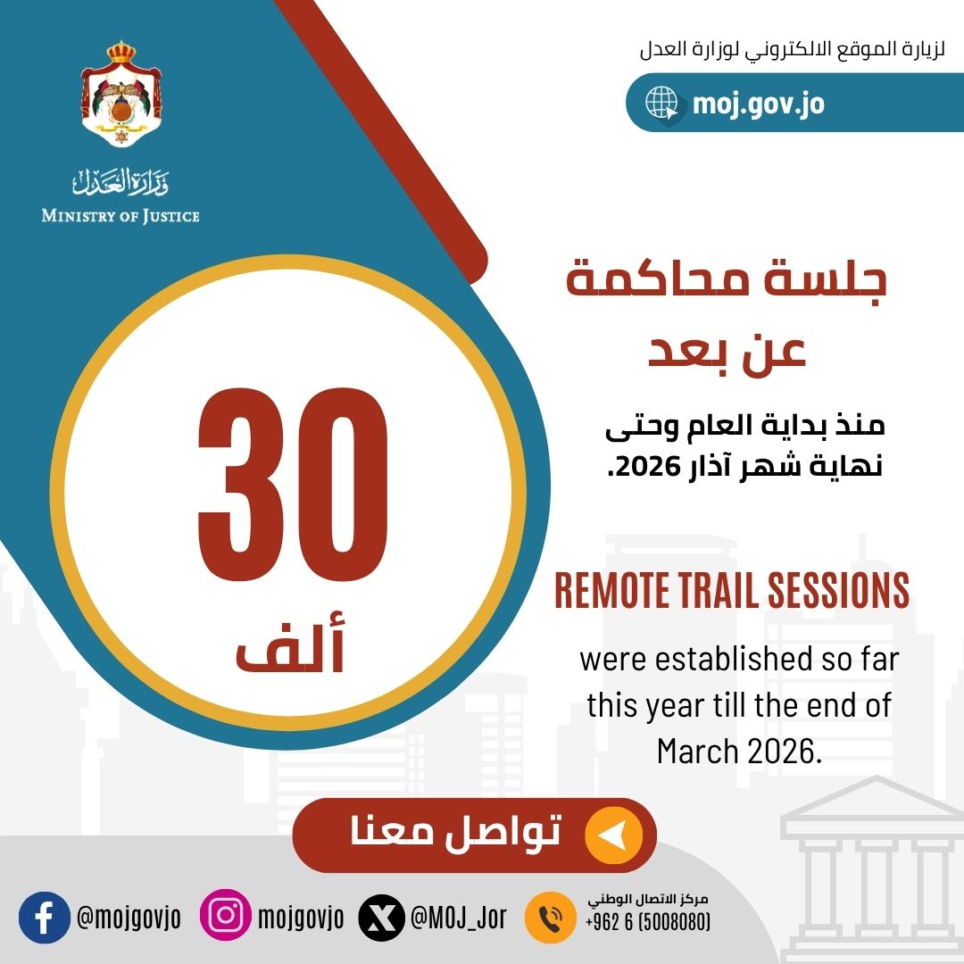Ammon News - The Ministry of Justice announced that 30,000 remote trail sessions were established so far this year till the end of March 2026.
