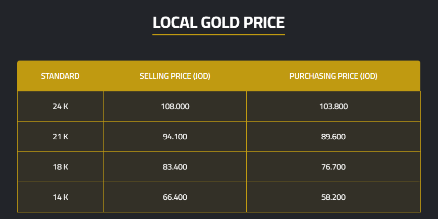 The selling prices per gram for 24-karat, 18-karat, and 14-karat gold were JD108.00, JD83.40, and JD66.40, respectively.