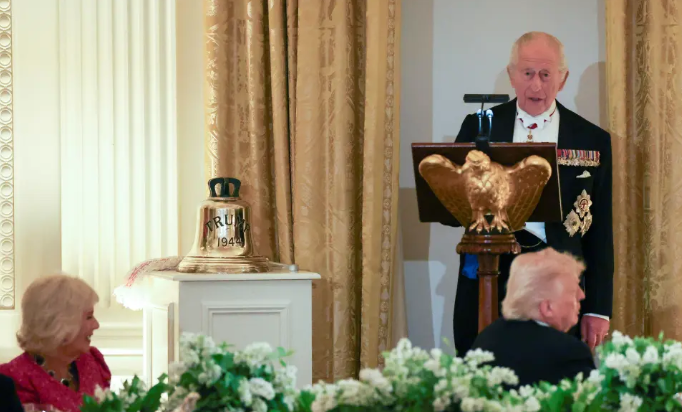 Ammon News - King Charles III presented President Trump with the bell from a World War II-era British submarine — dubbed the HMS Trump — at the White House state dinner Tuesday, where the two leaders bonded over highs and lows of the centuries-long US-UK relationship.
