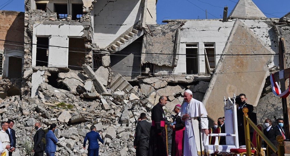 He then travelled by helicopter on to Mosul where he visited Church Square to pray for the victims of the war with the Islamic State group, which left thousands of civilians dead.