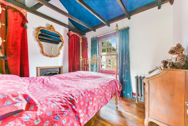 The three-bedroom house is set over three floors, with two bathrooms and features a quirky decor style throughout, with plenty of colour all around as well as vaulted ceilings and exposed beams.