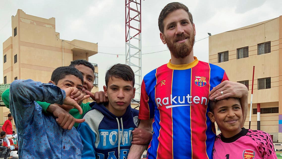 Seeing the excitement his presence causes at such events, the 27-year-old Egyptian painter is happy to pose as the Argentine, wearing a Barcelona shirt and joining in a game of football.