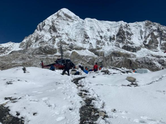 The area is the Khumbu Icefall, a constantly shifting glacier with deep crevasses and huge overhanging ice that can be as big as 10-story buildings. It is considered one of the most difficult and tricky sections of the climb to the peak.