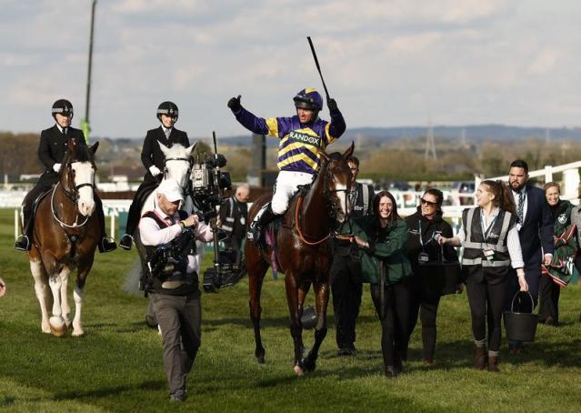 The 8-1 shot, owned by a seven-member syndicate who bought him for 17,000 pounds ($21,102) in 2020, soared over the last of the 30 jumps and bounded clear to victory down the home straight.