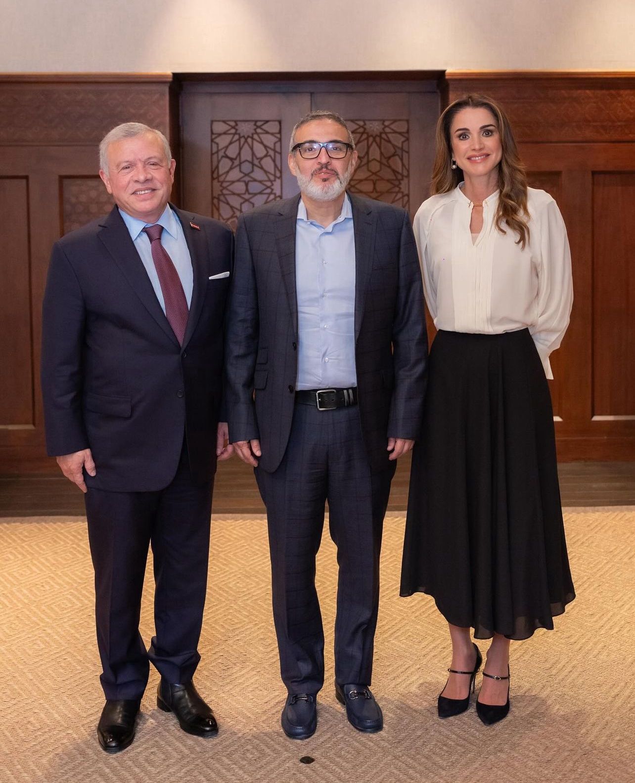 Her Majesty Queen Rania wrote on her official account on Instagram: 'Joining His Majesty earlier today for a meeting with Dr. Ghassan Abu-Sittah, one of the many heroic doctors who have put their heart and soul into saving as many of the people of Gaza as possible.'